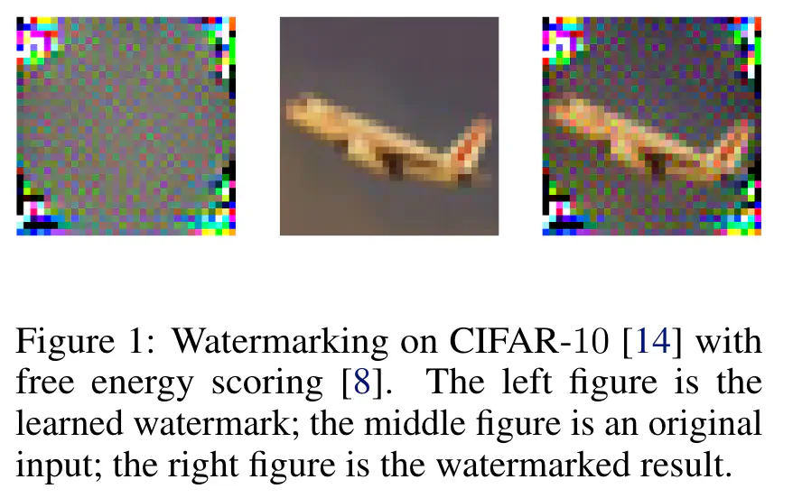 为了理解水印,图 1 描述了在 CIFAR-10 数据集上学习的水印,以及energy-scoring。正如我们所看到的,学习到的水印的中心区域很大程度上保留了原始输入模式,包含原始指导检测的语义消息。相比之下,原始输入的边缘区域由水印的特定图案叠加,这可以对模型隐藏的知识进行编码,以增强 OOD 检测。总体而言,水印可以在检测中保留原始输入的有意义的模式,并通过从训练模型和 ID 数据中学习到改进的检测能力。